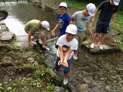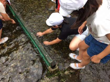 避難訓練の後、部屋に戻って魚つかみの用意をしていると、空が雨雲に覆われ、雨が降りだしましたが、集合時間には上がって涼しくなりました。子どもたちはアマゴつかみに夢中です。