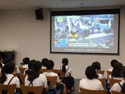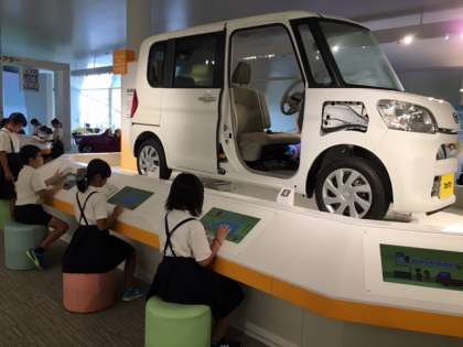 展示見学の後、実際に自動車を製造している工場を見せていただきました。池田工場では1日に1000台近くの車を作っていて、機械やロボット作業もありますが、重要な部分は全て人の手で行われていることを知りました。