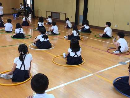 これまで発育測定や視力検査などの検診は保健室で行っていましたが、感染予防のため密にならないように、今回は講堂で行いました。フラフープの輪を利用して子どもたちが間隔をあけて座れるように工夫しました。