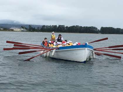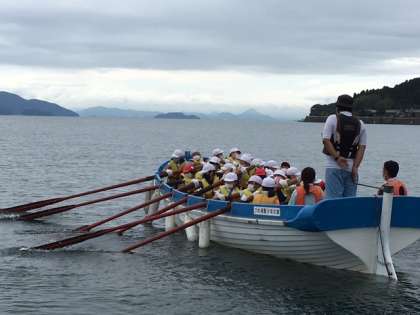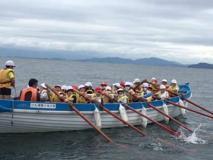 波は穏やかで、心地よい風が吹いています。リーダーの指示で櫂を漕ぐ練習を繰り返し、少しずつ動きがそろうようになりました。子どもたちはかけ声に合わせて全身で櫂を動かし、ゆっくりと船を進めていきました。