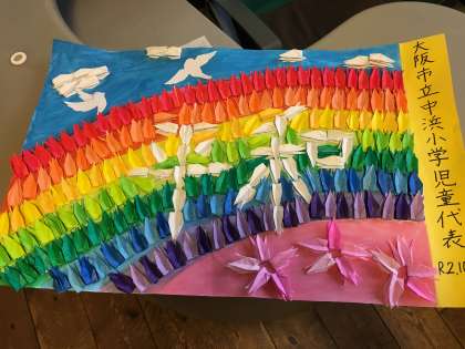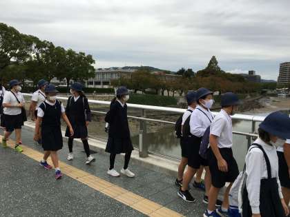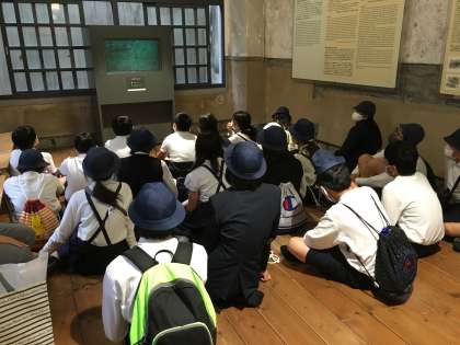 袋町小学校平和資料館には、原爆が投下され、消息がわからなくなった家族や友人をたずねる伝言が書かれた教室や廊下の壁の一部が保存されていました。平和を祈って作成したポスターをお渡ししました。