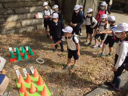18班が右と左の2つのコースに分かれて8つのポイントをまわり、ゲームやクイズに挑戦しました。