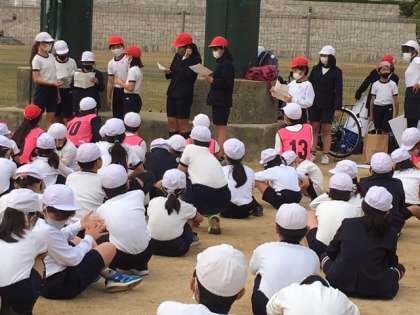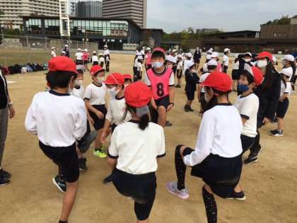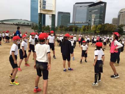 午後は集会委員会の子どもたちの進行で、太陽の広場で全校遊びを行いました。1年生から6年生まで、みんな一緒にゲームを楽しみました。