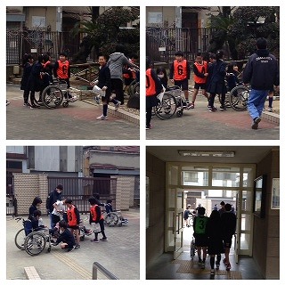 リハビリテーションセンターの方から、車椅子の扱いや動かし方を教えてもらいました。その後、グループに分かれて校内を車いすに乗って移動し、介助体験をしました。