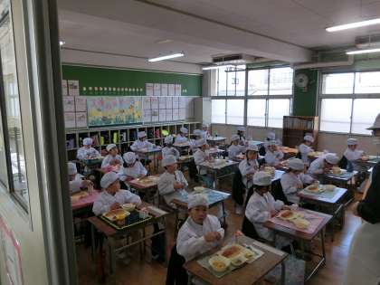 本日から給食が始まりました。一年生にとっては初めての給食となります。みんなで協力して配膳し、一緒に食べました。コロナ禍のため、にぎやかにおしゃべりしながら食事というわけにはいきませんが、初めての給食をおいしくいただいていました。