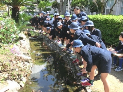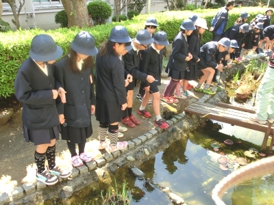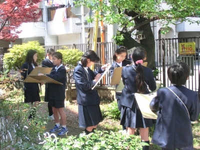 5年生は、理科の授業で「きねんの庭」の小川にいる生き物の観察【写真左・中】を行いました。4月になると暖かい日が多くなり、生き物の様子が冬の頃と比べて変わっていきます。どのように変わってきたのか、これからどのように変わっていくのか、生き物の様子を一年間観察していきます。今日はメダカや卵からかえったオタマジャクシを見つけました。また、6年生は、「春」のテーマで、正門横の桜の木の写生【写真右】を行っていました。