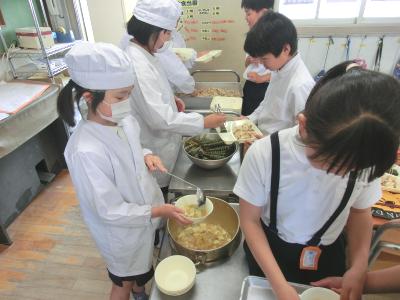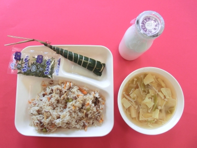 5月8日(金)、今日の給食は「牛肉のちらしずし、五目汁、ちまき、牛乳」で、こどもの成長を願った「こどもの日の行事献立」でした。