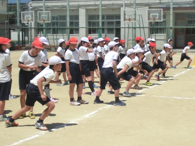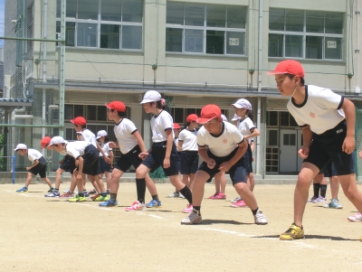 今日の授業では、走る能力を調べる「50m走」のスタートの仕方について学習を行いました。夏日で暑い最中でしたが、児童たちは一生懸命に取組んでいました。