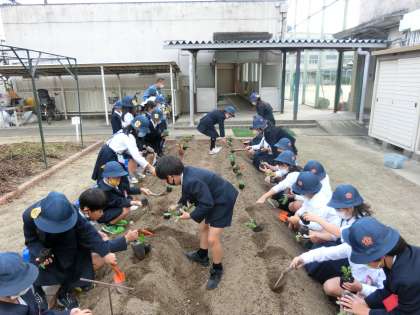 11月8日(月)1時間目は生活科の学習です。1年生のみんなは、小島先生に花の苗の植え方を教わりました。ポットから苗の取り出し方や苗を植える深さをていねいに教わりました。矢車草やナデシコなど数種類の花の苗を植えました。きれいな花が咲くのが楽しみです。