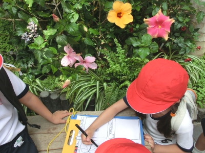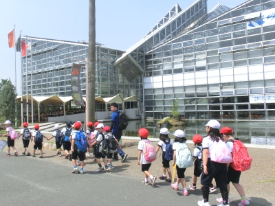 5月15日(金)、1・2年生67名は、春の遠足で花博記念公園「鶴見緑地」へ行きました。午前中はオリエンテーリングとして、班に分かれて「咲くやこの花館をたんけんしよう」をしました。「熱帯から極地」までの植物2,600種が栽培されている館内の「おもしろい花・葉っぱ・におい・み」を見つけて、シートに名前と特徴を絵に描いていきました。