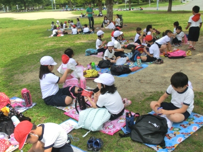昼食は大芝生広場でいただき、その後はおにごっこなど、みんな遊びをしました。大池から風車の丘をまわって、帰路につきました。天気が良すぎて、最後は少し疲れていましたが、無事に学校まで帰ってきました。