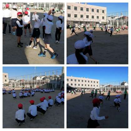 運動場中を歓声を上げながら走り回ってしっぽとりおにごっこをみんなで楽しみました。見ている人は「パプリカ」のダンスをしながら応援です。最後までつかまらなかった人には拍手を送りました。
