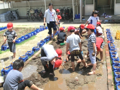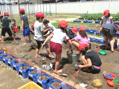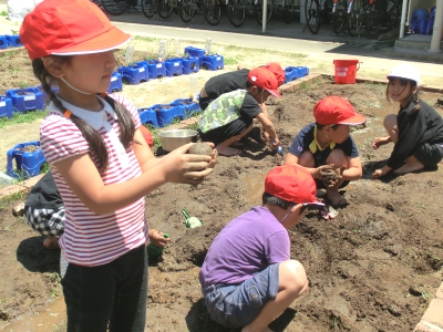 あらかじめ着替えを用意していますので、どろんこになってもへっちゃらです。水をたっぷり入れて、からだ全体で土の感触を楽しんでいました。バケツやスコップを使って、山をつくり、トンネルを掘り、川をつなげ、どろ団子を並べ、みんな夢中で活動できました。「またやりたいなぁ〜」と、みんな口を揃えて言っていました。1年生の学習園には、ひまわりやフウセンカズラを6月に植える予定です。