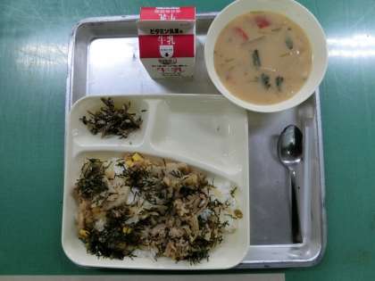 本日から給食がスタートしました。本日の献立は、れんこんのちらしずし、ぞう煮、ごまめでした。正月を想起する献立です。子どもたちもおいしく食べていました。