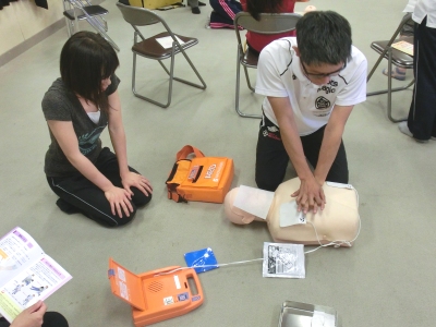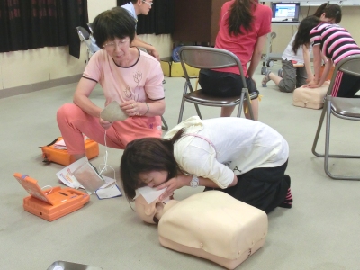 6月15日からは、全学年ともプール水泳の授業が始まります。毎年この時期に、万が一に備えて心肺蘇生の実技講習会を実施しています。半身の人形を使って、胸骨圧迫と人口呼吸をし、AEDを使って、「助かる命を助けるため」に救命処置の技能を習得していました。参加した先生方は、真剣な表情で、繰り返し練習をしていました。いつでも、どこでも、尊い命を救うために、正しい応急手当を身につけたいものです。