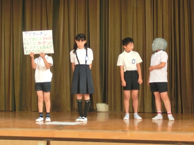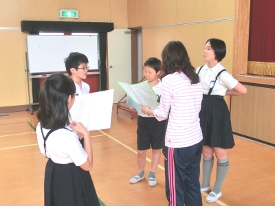 たてわり班ごとに分れて、お店のPRのためのCMを30秒ですることになっています。お店は、はてなでカーテン【写真左】やコイン落とし【写真中】、紙ひこうき飛ばし、宝さがしなどです。CMが完成していない班は、昼休みに体育館に集合して練習【写真右】をしていました。みんなで協力して楽しい中浜フレンドリーランドにしましょう。