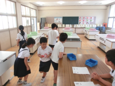 17・18班は家庭科室で、赤・青・緑・黄色の宝石をみんなで協力してみつける「たからさがし」【写真左】をしました。19・20班は、理科室で水槽の中の牛乳ビンやコップにコインを入れる「コイン落とし」【写真右】をしました。一人だけ最高得点の12点がでました。それぞれがスタンプカード【写真中】を持って、10のお店をまわりました。途中、8つのポイントをまわって「虫くいパズル」もしました。