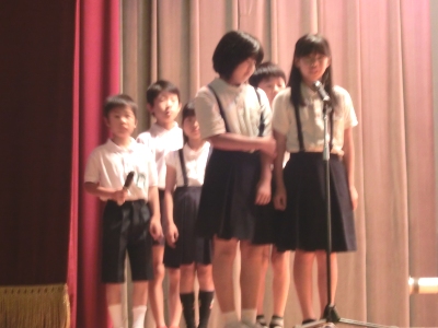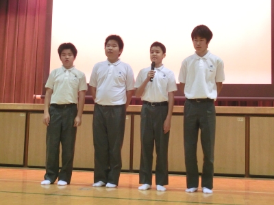 児童集会の最後は、今日から2日間、本校で職業体験する中学生から児童全員にあいさつ【写真右】をしてもらいました。