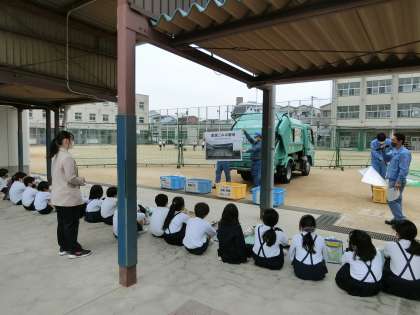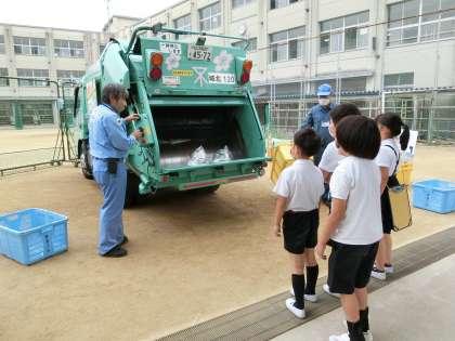5月17日(火)4年生が環境事業局の方を講師にお招きし、出前授業を行いました。ごみの分別の仕方や集められたごみの処理のされ方を学びました。その後、実際にパッカー車に準備したごみを入れて、ごみが取り込まれていく様子を見学しながらパッカー車の仕組みを教えてもらいました。パッカー車にも乗せてもらって、児童からは初めてのことがたくさんあって楽しかったと感想が聞こえてきました。