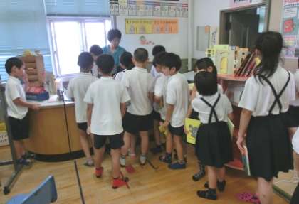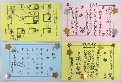 今週から「図書スタンプラリー」を行っており、低学年は8冊、中学年は10冊、高学年は5冊(絵本は除く)読むと、図書委員会から表彰状【写真中】がもらえます。図書カウンターのところは、本の貸し出しとスタンプカードの押印で行列【写真右】ができるほど盛況でした。