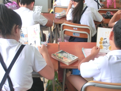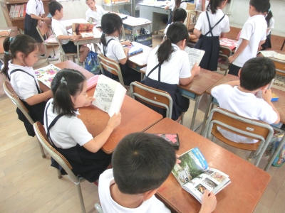 図書館は西校舎にあり、校内移動に時間がかかることから、東校舎の学習室を「ミニ図書館」として、蔵書の整備を進めているところです。各教室では学級文庫やミニ図書館から本を持ってきて、静かに読書をしていました。読書タイムの時間は、静かなBGMも放送で流しています。