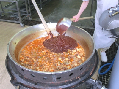 ハヤシライスは、日本が発祥で、子どもたちの人気メニューのひとつです。給食調理室をのぞくと、ニンジンを型でくり抜いて、ラッキーニンジンに調理【写真左】していました。直径90cmの大鍋で、牛肉・玉ねぎ・じゃがいも、セロリなどを炒めて、ハヤシライスのルウを作っていました。小麦粉から作った手作りルウ【写真中】と相まって、とてもまろやかな味わいでした。また、今日の果物は、この時期に年1回しか出てこないサクランボ【写真右】で、子どもたちも大喜びでした。
