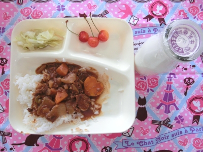 6月23日(火)、今日の給食の献立は、「ハヤシライス・キャベツのゆずドレッシング・サクランボ」でした。
