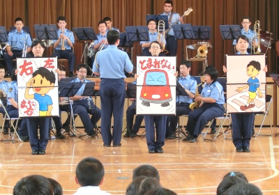 続いて、交通安全の歌「みんなで守ろうね」を6人の警察官が、プラカードを持って歌っていただきました。「横断歩道を渡るとき」「信号チカチカ始めたら」「自転車に乗って出かけよう」「道路は危険がいっぱいだ」の4番まであり、交通ルールについて学習をしました。