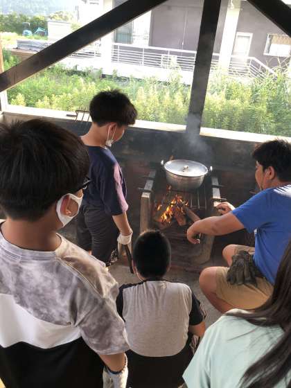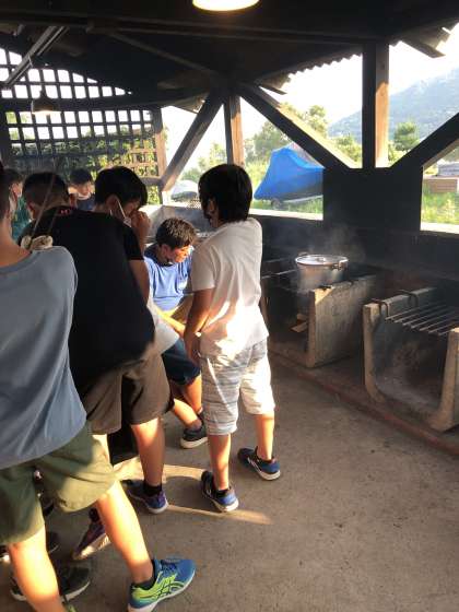 夕食のカレーライスを作っています。薪が燃える炎に悪戦苦闘しながら、美味しいカレーライスを調理中です。できあがりが楽しみです。