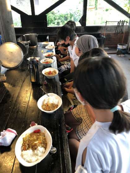 昨日の夕ご飯のカレーライスです。時間が掛かってしまい、遅くなってしまった用です。その分、お腹も空いていたのではないでしょうか。自分たちで作ったカレーライスは格別なものになったと思います。