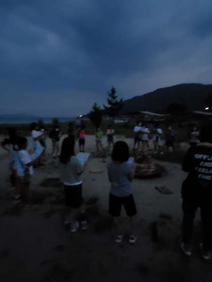 夕食を終えお腹が膨れたところです。空が少し薄暗くなってきました。予定を少し変して、キャンプファイヤーを始めます。