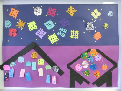 7月1日(水)、今日から玄関の掲示物も、花火、風鈴、ヨーヨーの切り絵で夏祭りをイメージしたものに変わりました。風鈴の短冊【写真左の下】には、6年生がつくった俳句が書かれています。