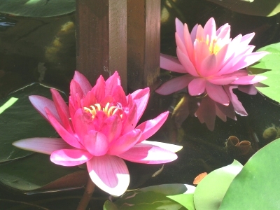 学校の「きねんの庭」を流れる小川には、スイレンの花【写真右】が咲いています。水面にふわりと浮かんでいる姿は可憐です。