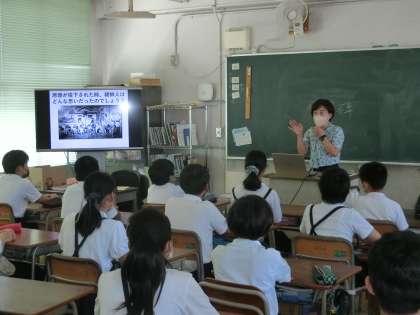 6年生は、戦時下の韓国朝鮮の人たちの暮らしや様子を教えていただきました。修学旅行へ行く広島にも韓国朝鮮の人たちがいて、1945年に原子爆弾を投下されたときにはその爆弾の被害にあった人たちがいたことも教えていただきました。児童は真剣にソンセンニムの授業を聞いていました。
