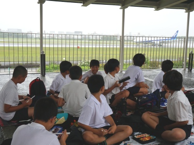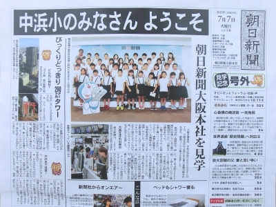 昼食は大阪空港横の「伊丹スカイパーク」【写真中】でいただき、午後から新聞社に向かいました。正面玄関で記念撮影をし、まずは見学ロビーで「新聞ができるまで」のビデオを見て、資料室や編集部を見学しました。児童たちは、帰り際に自分たちの集合写真が載った号外新聞をもらい喜んでいました。教科書だけではわからないことを学習した一日でした。