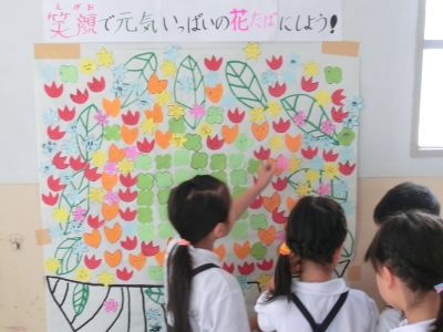 あいさつをしてもらった花びらで、花束【写真中】を完成させました。「あいさつ週間」は終わりましたが、明日からも「1人のあいさつ みんなが笑顔」を忘れずに、元気よく笑顔であいさつをしてほしいです。