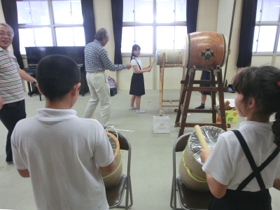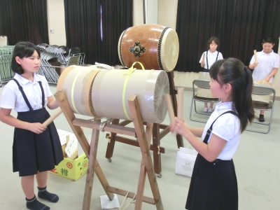 7月9日(木)放課後、中浜盆おどりの「太鼓練習」の3日目です。1日目は、多目的室で音頭に合わせて練習用の太鼓でリズムをとる練習【写真左・中】をしました。2日、3日目は、体育館で実際に太鼓を打って、本番さながらの練習【写真右】を行いました。