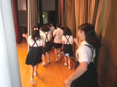 7月9日(木)、今日の児童集会は、「何人とおったかな」をしました。体育館の舞台幕の間を通った人数を数えますが、覆面などで仮装した人は数えません。答えはABCの3択です。Aと思った班は円陣を組む、Bと思った班は手を前の人の肩にのせて一列になる。Cと思った班は一列になって座るというルールです。なかよし班のみんなで協力をして、123‥と人数を数えていました。ほとんどの班が正解で、とても驚きました。