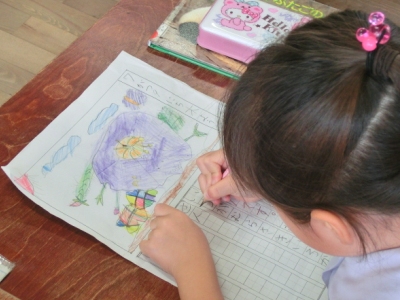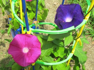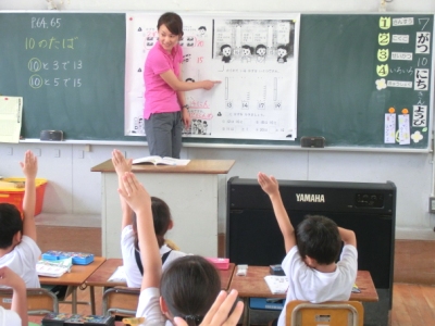 2時間目に1年生の教室を訪ねてみました。1年1組【写真左】は、国語の時間に、昨日「あさがお」の観察した日記を書いているところでした。1年生のみなさんは、生活科の授業で5月に「あさがお」の種をまき、毎日の水やり、葉やつるの観察、支柱をたててつるをからませ、やっと大輪が見事に咲きはじめました。1年2組【写真右】は、算数の授業で、計算の意味や仕方を図を用いて学習していました。みんな元気に手を挙げて、発表をしていました。