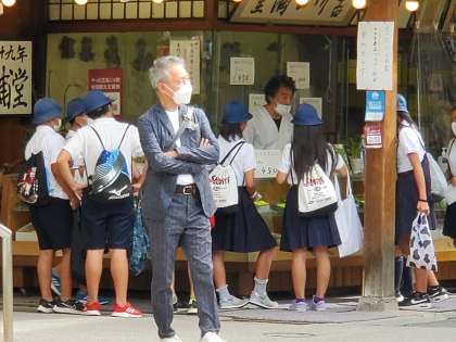 厳島神社の見学を終え、近くのお店を探索中です。おみやげは何がいいか、いろいろ考えているようです。