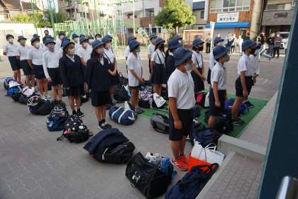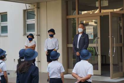 中浜小学校に到着しました。帰校式が始まりました。