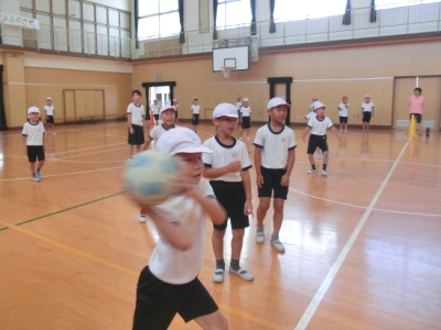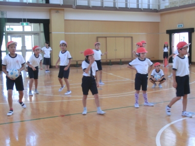 自分たちでルールを決め、赤組・白組に分かれて、第1試合はボール2個で、第2試合はボール3個で、ドッジボールをしました。左右・前後から同時にボールが投げられるので、身をかわすのに必死です。3年生は汗をいっぱいかいて、元気に楽しく活動しました。
