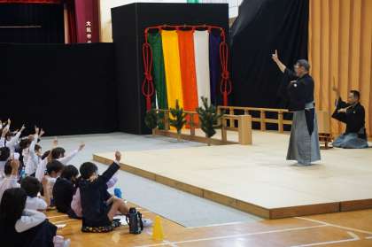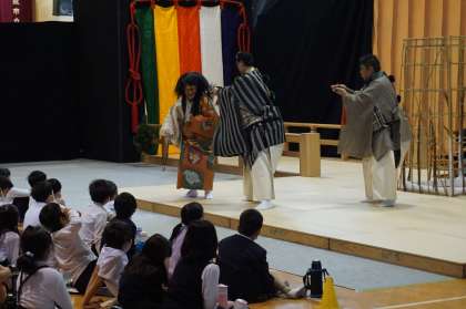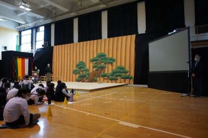 大槻能楽堂の方に来ていただいて、『能』について教えていただきました。お囃子は迫力があり、一気に児童は能の世界へ引き込まれました。最後に、『安達原(あだちがはら)』の一場面を鑑賞した際は、鬼女(きじょ)の様子にたじろいでいました。日本古来からの文化芸術に触れる良い機会になりました。