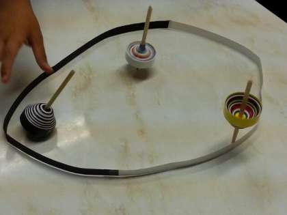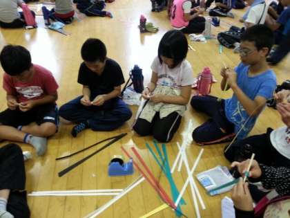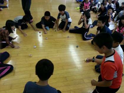 7月23日(木)9時、雨はまだ降り続いています。雨天時の活動として予定していた「コマづくり」を多目的ルームで行いました。根気のいる作業で、紙テープを割り箸に巻き付けて、円柱に仕あげていき、木工ボンドで固めて完成です。できあがった自慢のコマで、班長・副班長【写真右】・班代表・5年・6年・先生対抗の6試合を行いました。優勝者の班には、「活動ポイント」が3ポイント与えられということで、応援も必死でした。楽しい活動ができました。