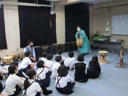 3年生は韓国朝鮮の打楽器について教えてもらいました。『プク』や『チャンゴ』を実際にたたき、韓国朝鮮のリズムを味わいました。