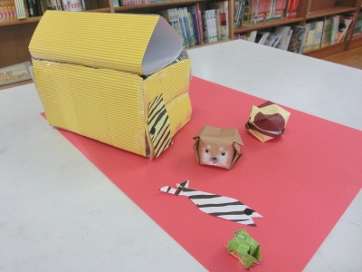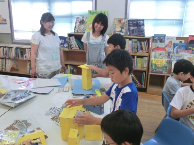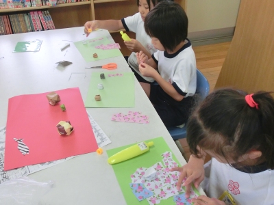 7月30日(木)午前、PTA学級・図書委員さんに来ていただいて、図書館開放のお手伝いをしていただいています。今日も、読書や学習をしているかたわらで「切り紙・貼り紙」をみてくれていました。児童たちは折り紙で動物をつくり、紙を切り張りして作品をつくっていました。家庭ではなかなかできない遊びを楽しんでいました。