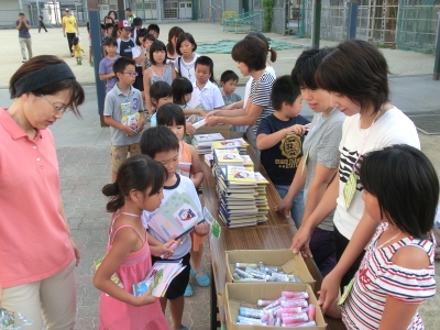 7時から運動場で、「ラジオ体操第1・第2」【写真中】を行い、ご褒美としてノート、スティックのり、ラムネ【写真右】をいただきました。明日からラジオ体操はありませんが、早寝早起きを励行し、楽しい夏休みを過ごしましょう。
