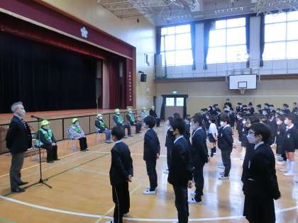 代表の鳴木さんからは、「中浜の地域は、路地が多く、自転車が速いスピードで走っています。車より自転車に気を付けてください。」とお話がありました。また、あいさつについては、「大きな声であいさつをされるとうれしいです。あいさつを大切にしてください。」とありました。これを機会に、見守り隊の方の顔と名前を覚え、今よりもっと気持ちの良いあいさつができるようにしていけたらと思います。