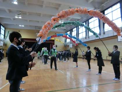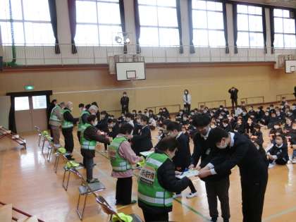 毎日登校を見守っていただいている隊の方へ、児童は感謝の気持ちを込めたお礼の手紙を渡し、『ありがとうの花』の歌を斉唱しました。