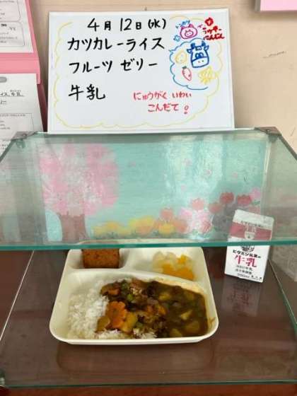4月12日(水)今日の給食の献立は、「カツカレーライス フルーツゼリー 牛乳」です。一年生の入学をお祝いする献立です。